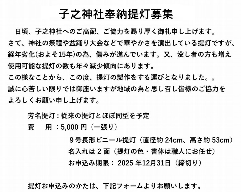 ※個人情報の取扱いについて ご記入いただいた個人情報は、提灯のお申し込み確認のためのみに利用します。 また、この目的のためにお問い合わせの記録を残すことがあります。